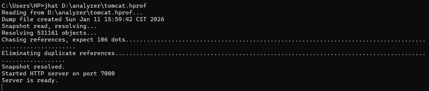 jhat(Java Heap Analysis Tool)是 JDK 内置的轻量级堆快照分析工具,专门用来解析 jmap 导出的 .hprof 格式堆 Dump 文件。它的核心原理是:将二进制的堆快照文件解析成结构化数据,然后启动一个本地 HTTP 服务器,可通过浏览器以可视化的方式查看堆内存的详细信息(比如对象分布、引用链、实例内容等),无需手动解析复杂的二进制文件。