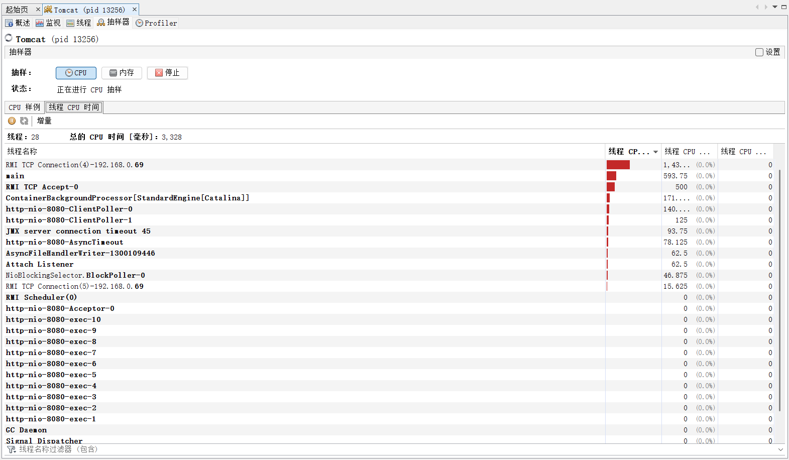 Visual VM 有两个采样器,在"Sampler"页面下,显示了CPU和内存两个性能采样器,用于实时地监控程序信息。CPU采样器可以将CPU占用时间定位到方法,内存采样器可以查看当前程序的堆信息。