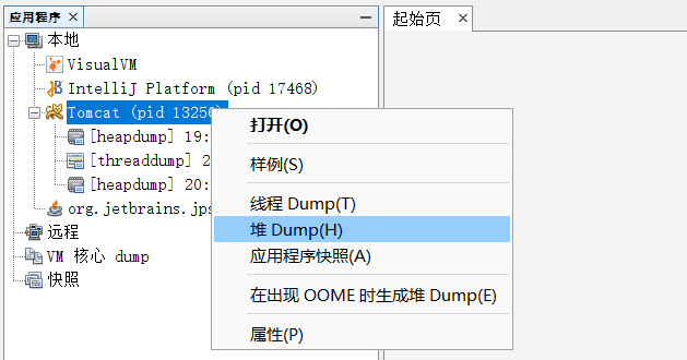 通过右键菜单中的"堆Dump"选项,可以立即获得当前应用程序的内存快照,如图所示(相当于jmap命令):