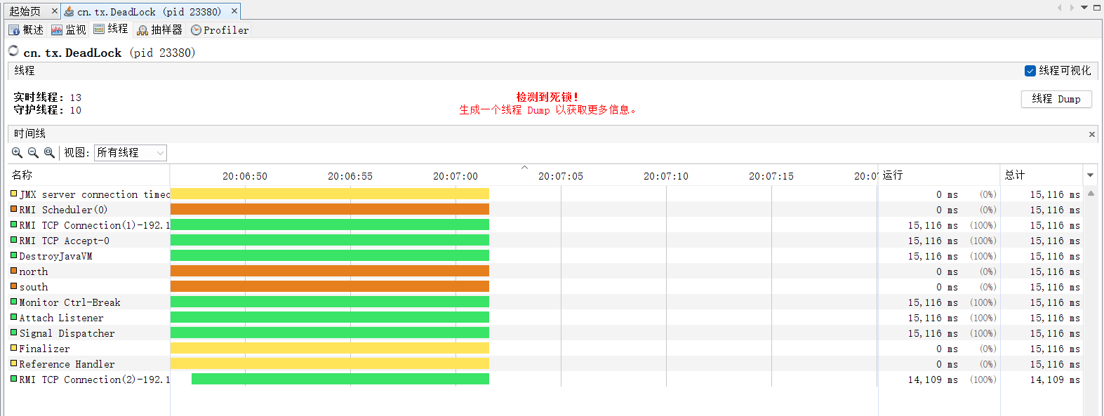 如果 Visual VM 在当前程序中找到死锁,则会以十分显眼的方式在线程页面给予提示,如以下死锁程序: