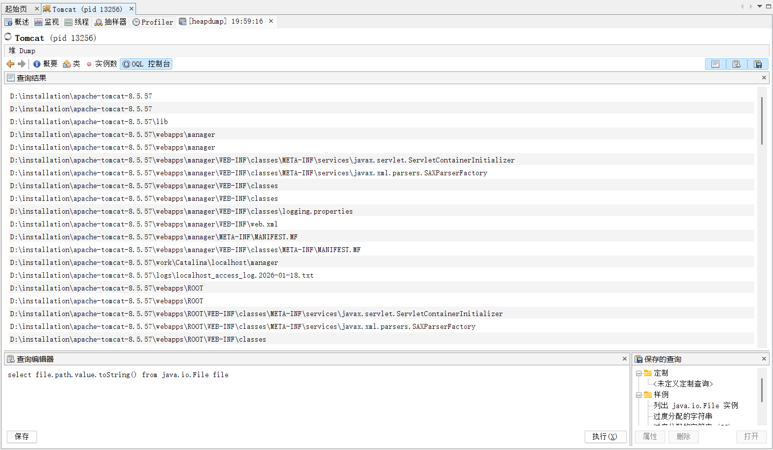 使用OQL查询出当前Java程序中所有java.io.File 对象的路径: