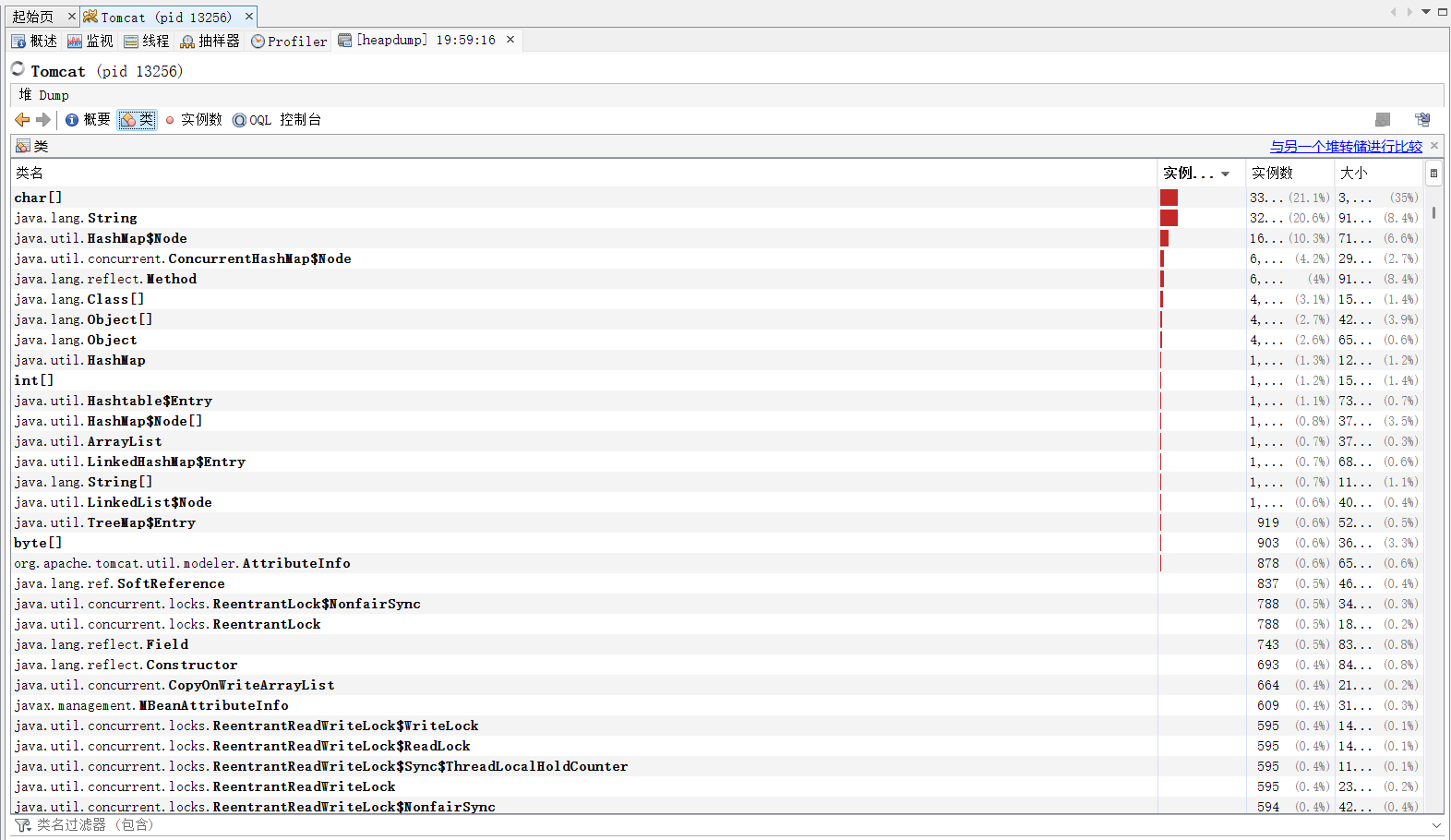 在顶部的Tab页中,提供了4个基本功能页:概要、类、实例和OQL控制台。
