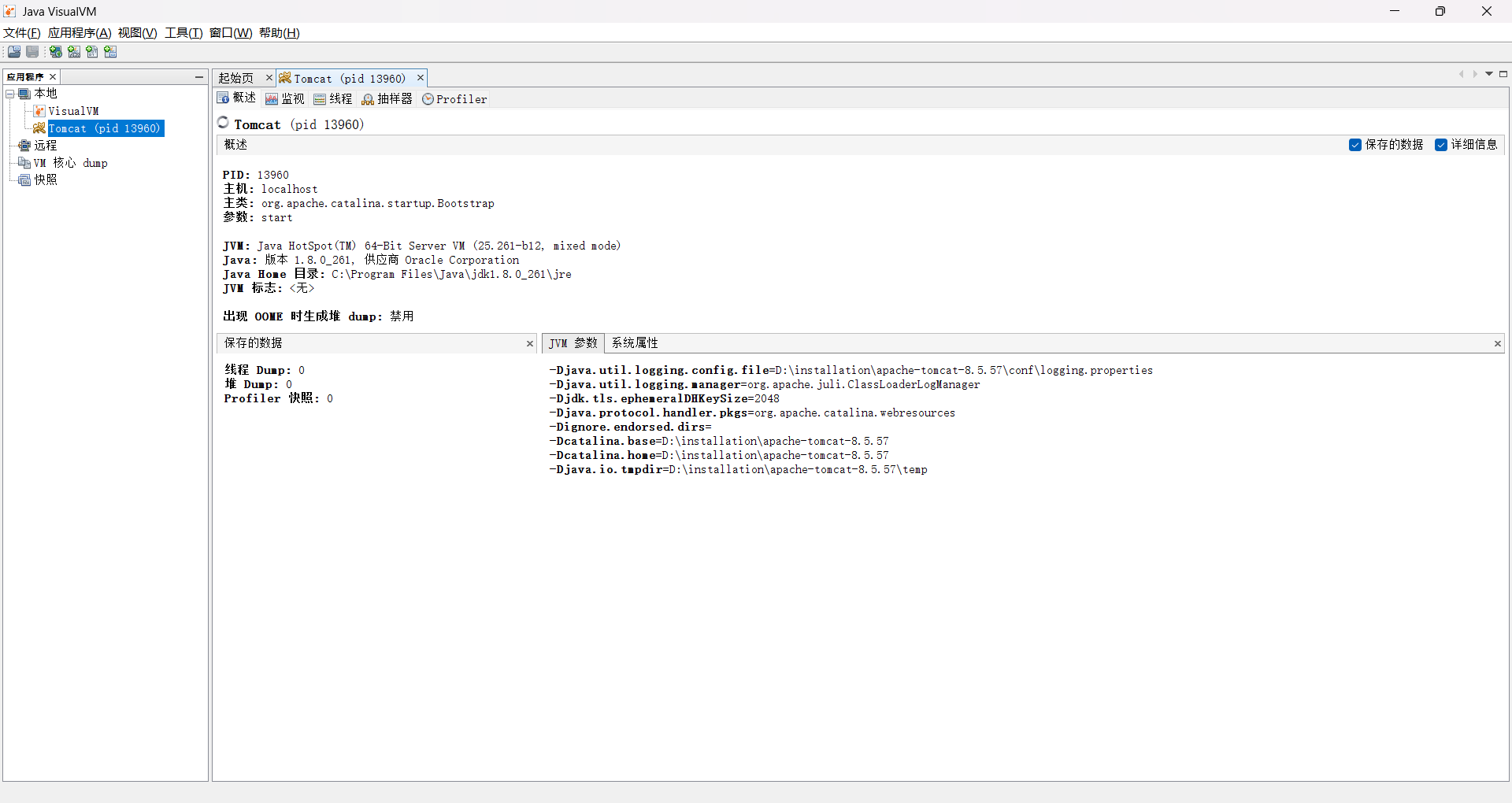 首先启动一个程序,我这里启动的是 tomcat 程序,双击 apache-tomcat-8.5.57\bin\startup.bat,再打开 jdk 的安装目录双击 C:\Program Files\Java\jdk1.8.0_261\bin\jvisualvm.exe