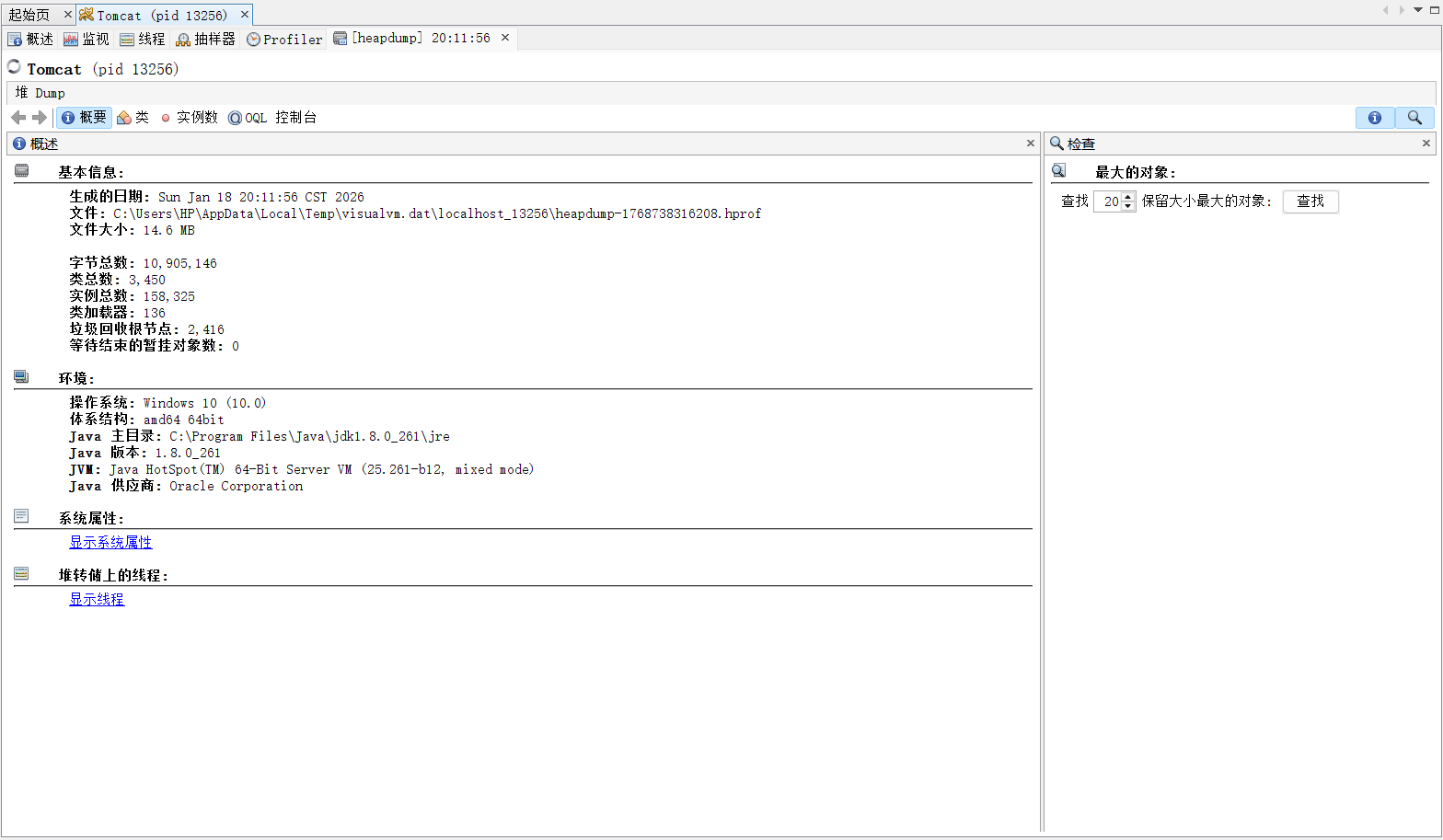 (1) 概要页面展示了当前内存的整体信息,包括内存大小、实例总数、类总数等。