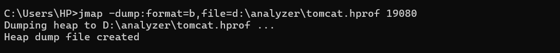 jmap -dump:format=b,file=d:\analyzer\tomcat.hprof 19080