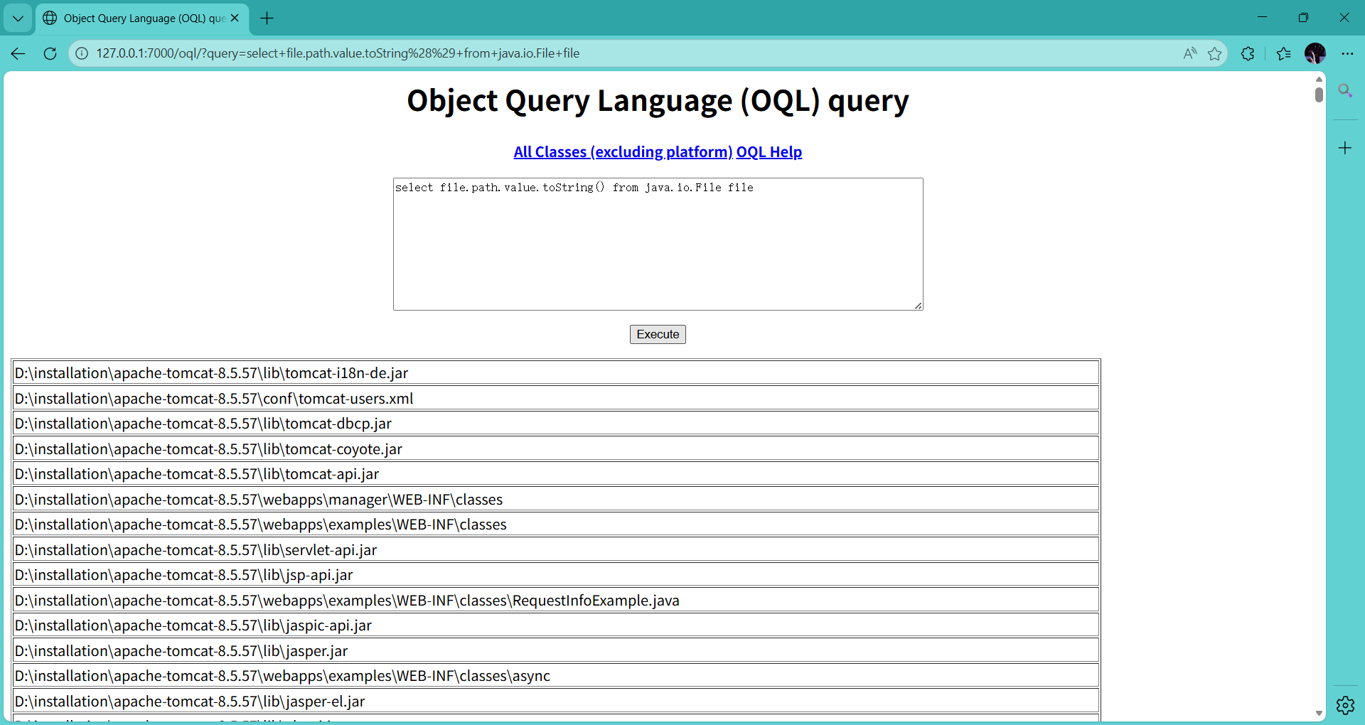 通常,导出的堆快照信息非常大,由于信息太多,可能很难通过页面上简单的链接索引找到想要的信息。为此,jhat还支持使用OQL语句对堆快照进行查询。使用OQL查询出当前Java程序中所有java.io.File 对象的路径:
