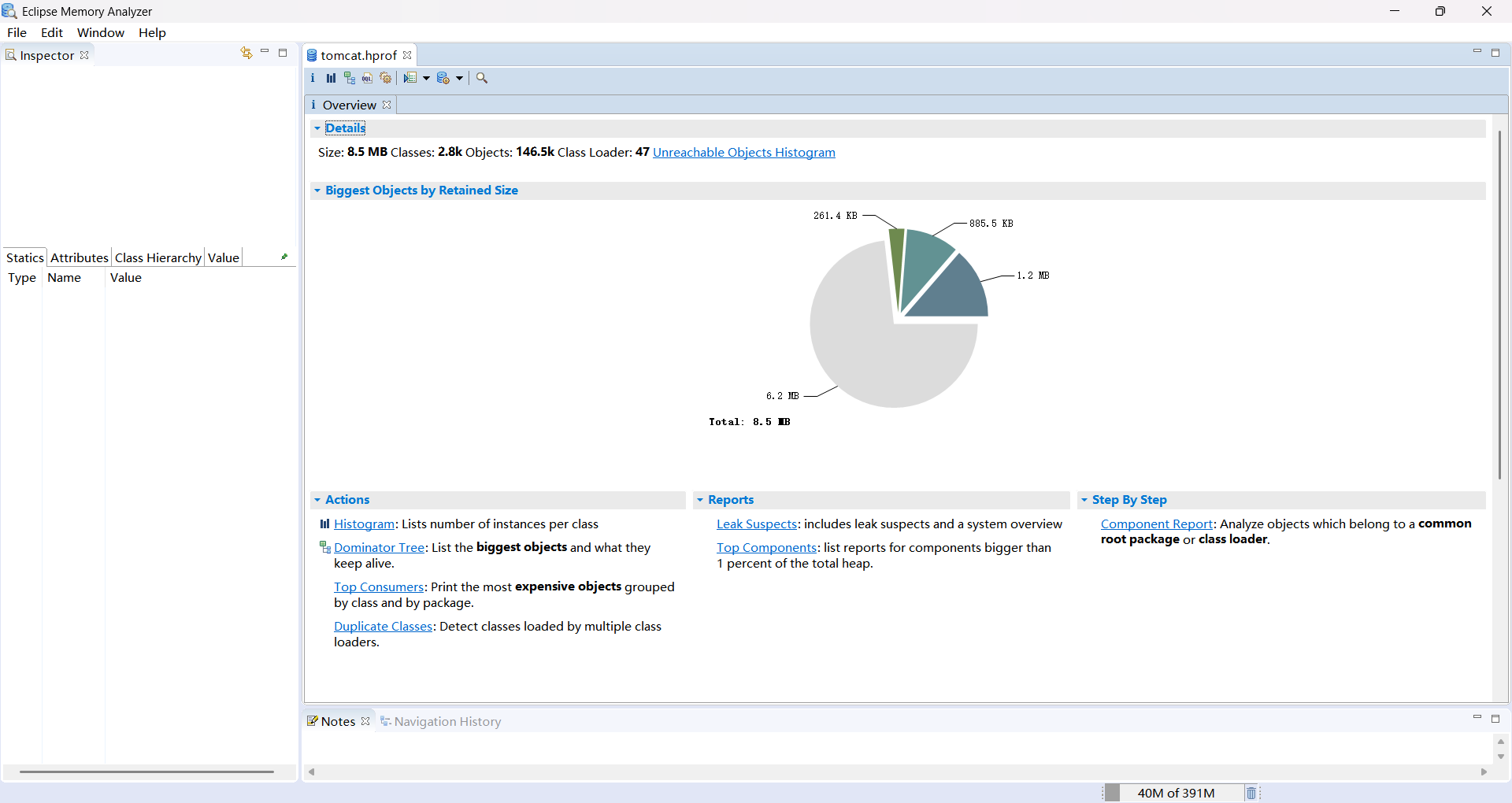 可以通过多种工具分析该堆文件,比如jhat工具,或者Visual VM、MAT等工具。这里使用 MAT 工具打开: