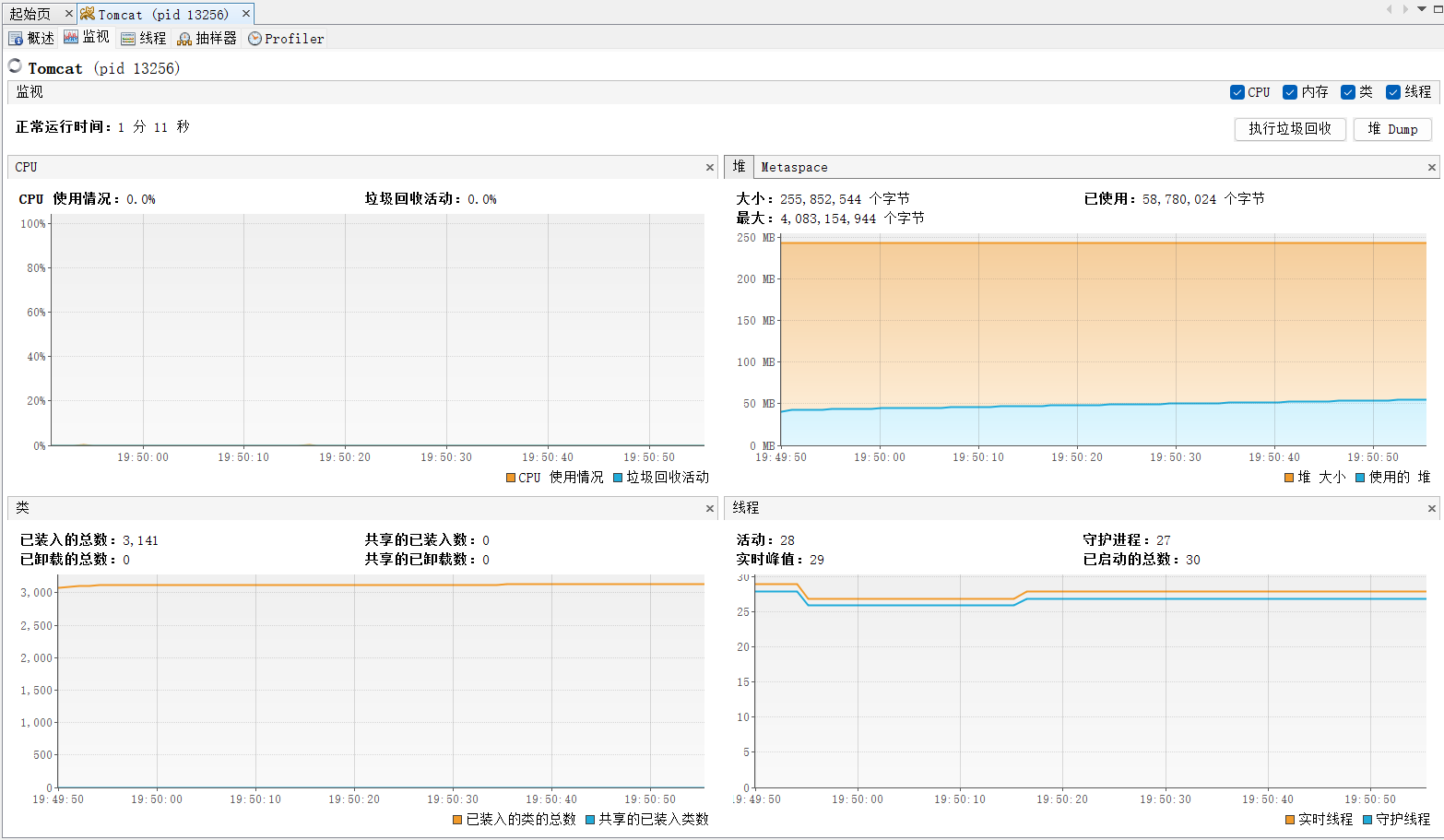 单击Tab页面上的监视页面,即可监控应用程序CPU、堆、永久区、类加载和线程数的总体情况,通过页面上的"执行垃圾回收"和"堆Dump"按钮还可以手工执行Full GC和生成堆快照,如图所示: