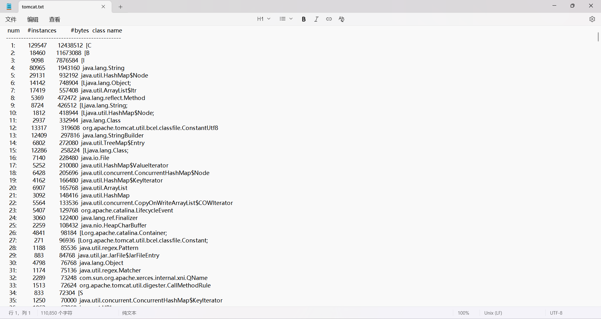 下例使用jmap生成PID为19080的Java程序的对象统计信息,并输出到 tomcat.txt 文件中: