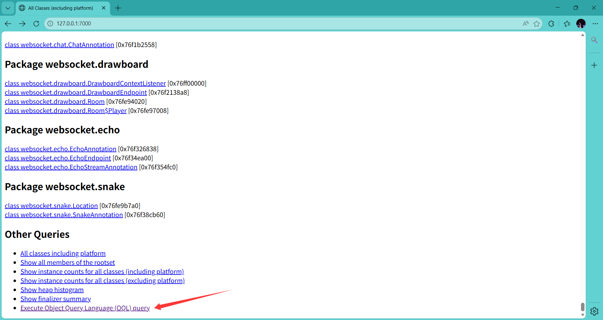 jhat在分析完成后,使用HTTP服务器展示其分析结果,在浏览器中访问 http://127.0.0.1:7000
