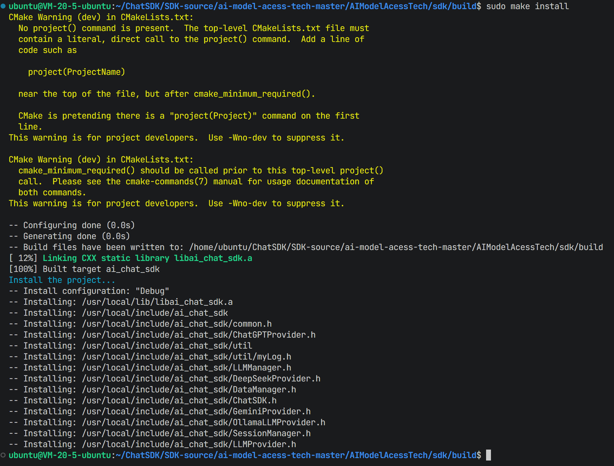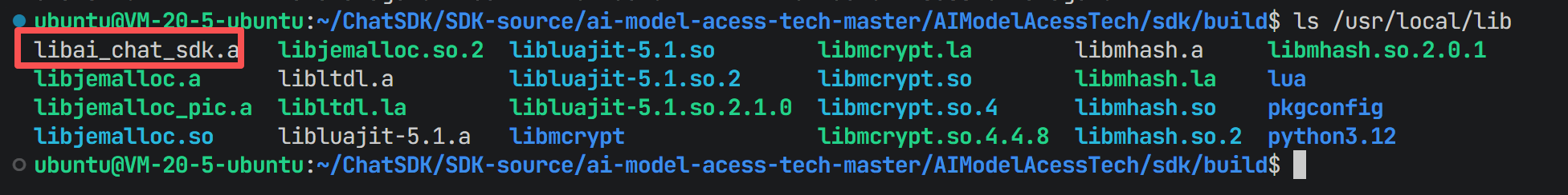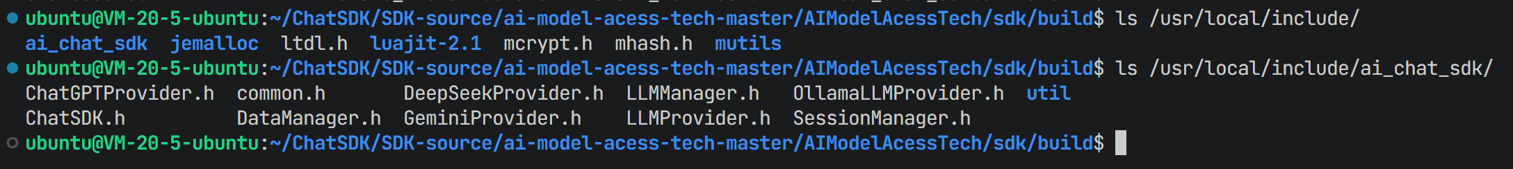验证安装结果,头文件位于 /usr/local/include/ai_chat_sdk/,库文件位于 /usr/local/lib/。