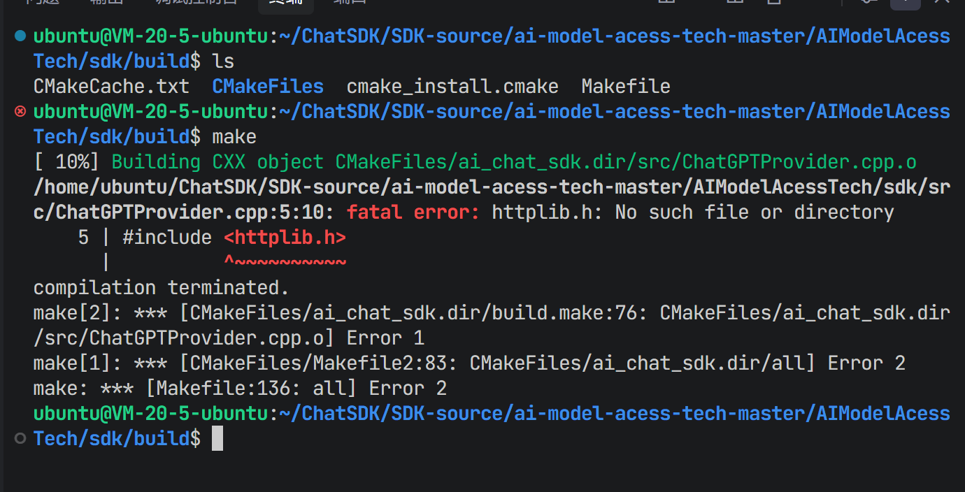 make命令开始编译。在初次编译时,系统抛出了错误,提示找不到httplib.h。