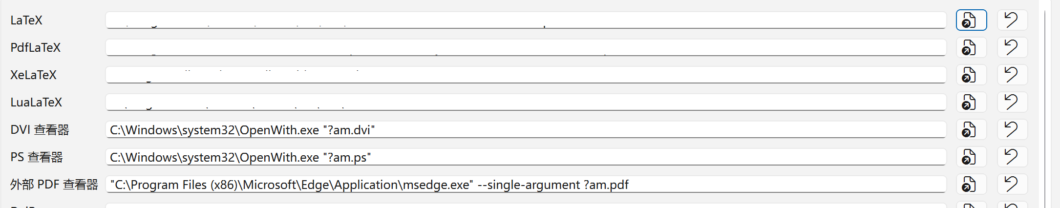 点击右侧的添加程序按钮,添加对应的编辑器程序exe文件。找到你的miktex安装的路径(例如,我的安装路径:D:/Program Files/MiKTeX),然后这几个exe文件在/miktex/bin/x64/文件夹下: