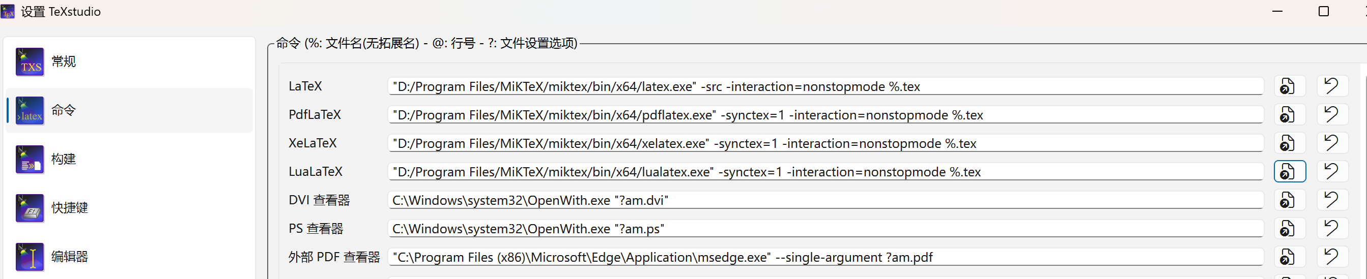 检查菜单栏中 选项/Option → 设置TeXstudio → 命令发现是texStudio没有检索到程序的路径: