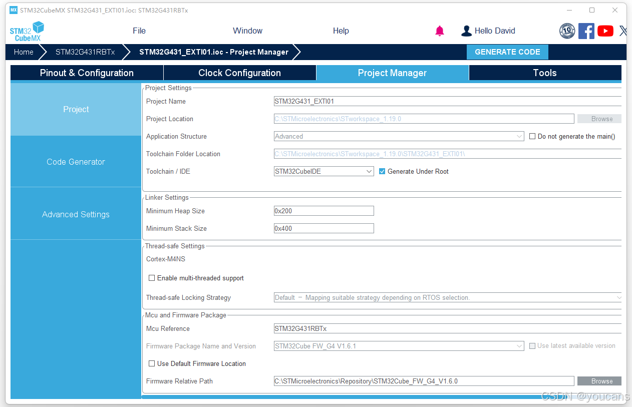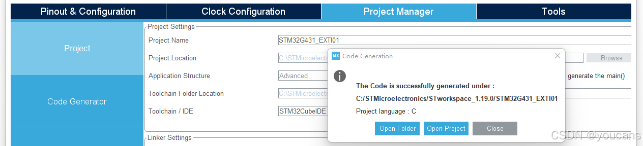 生成初始代码完成后,点击"Open Project"直接打开工程代码。