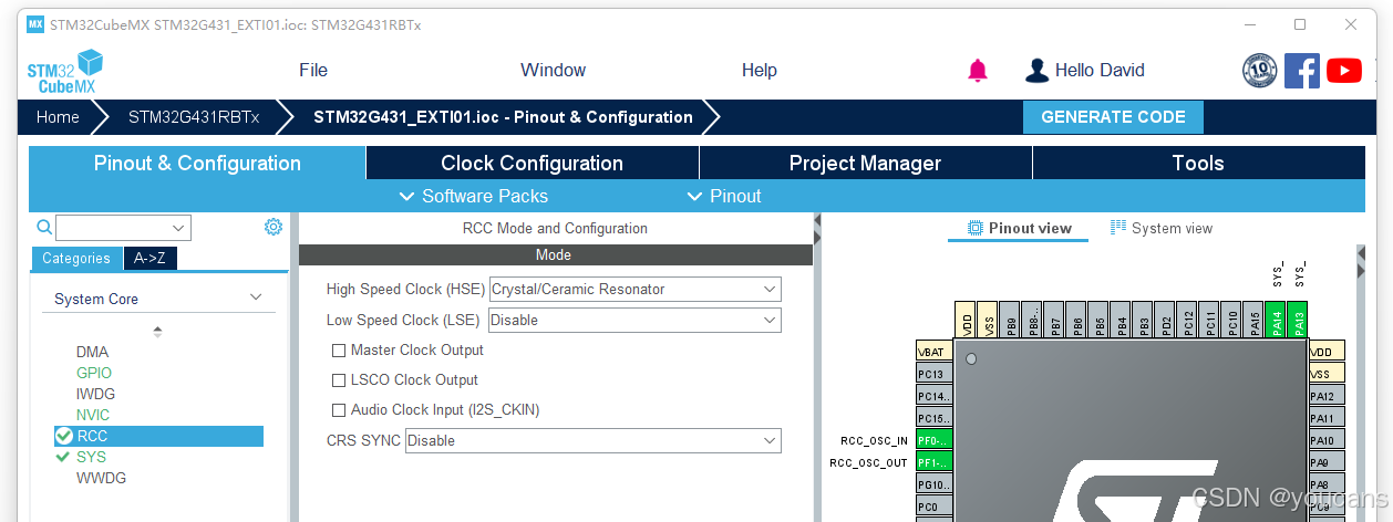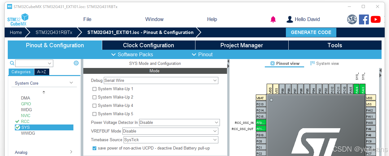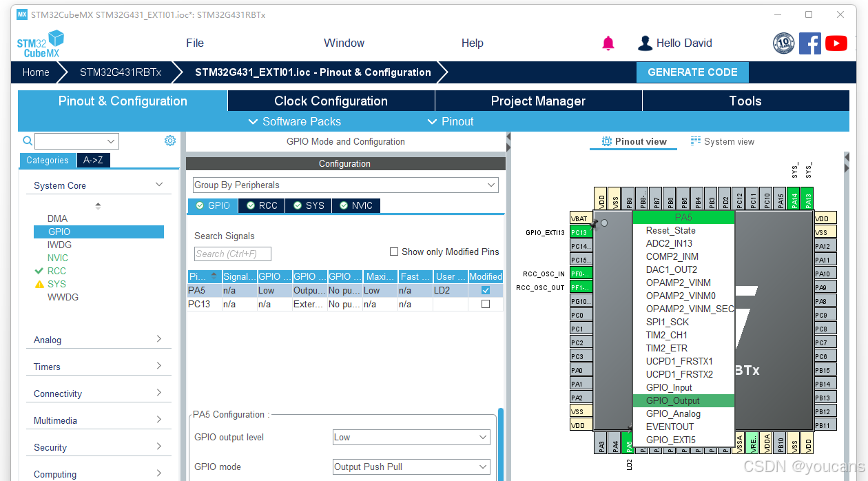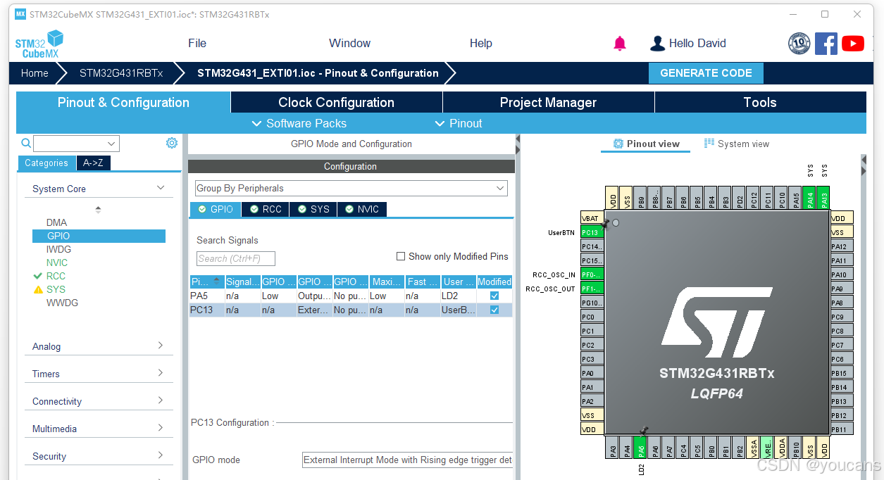 本实验使用 NUCLEO-STM32G431RB 开发板,涉及两个关键的GPIO引脚: