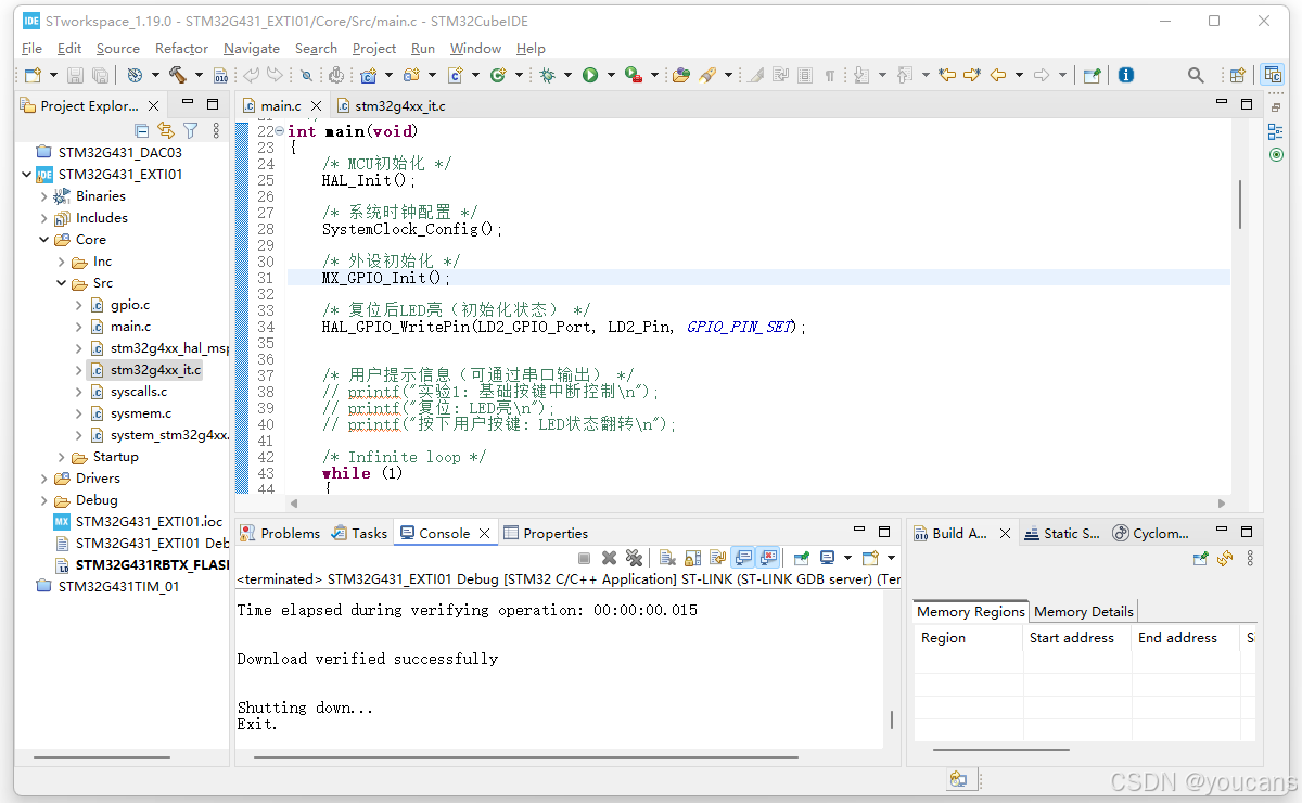 实验目的:实现按键触发外部中断控制LED状态翻转,掌握STM32G4外部中断的基本配置和使用方法。