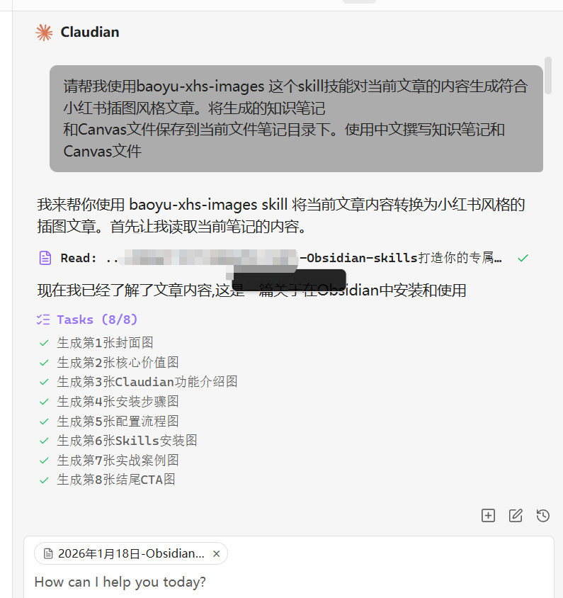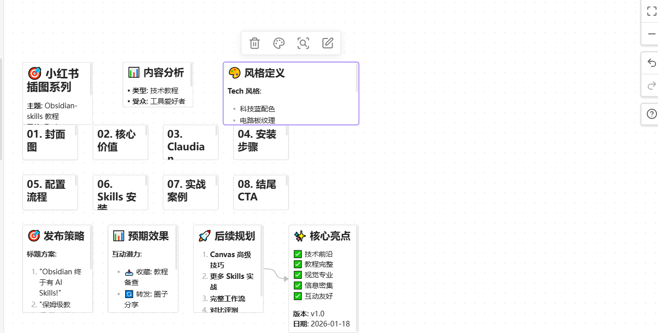 通过这套实践方案,知识工作者和笔记爱好者能够高效突破手动绘图和格式整理的繁琐痛点------借助安装 claudian 插件、配置 AI 模型、启用 obsidian-skills 三个核心步骤,无需专业设计技能和大量时间投入,就能快速实现一键生成精美笔记(如本次演示的"西安饮食知识结构图"和"小红书风格笔记")。无论是 Canvas 画布生成、知识结构图制作,还是小红书笔记转换、思维导图创建,都能通过简单的 AI 提示词完成,极大提升笔记创作效率和内容质量。