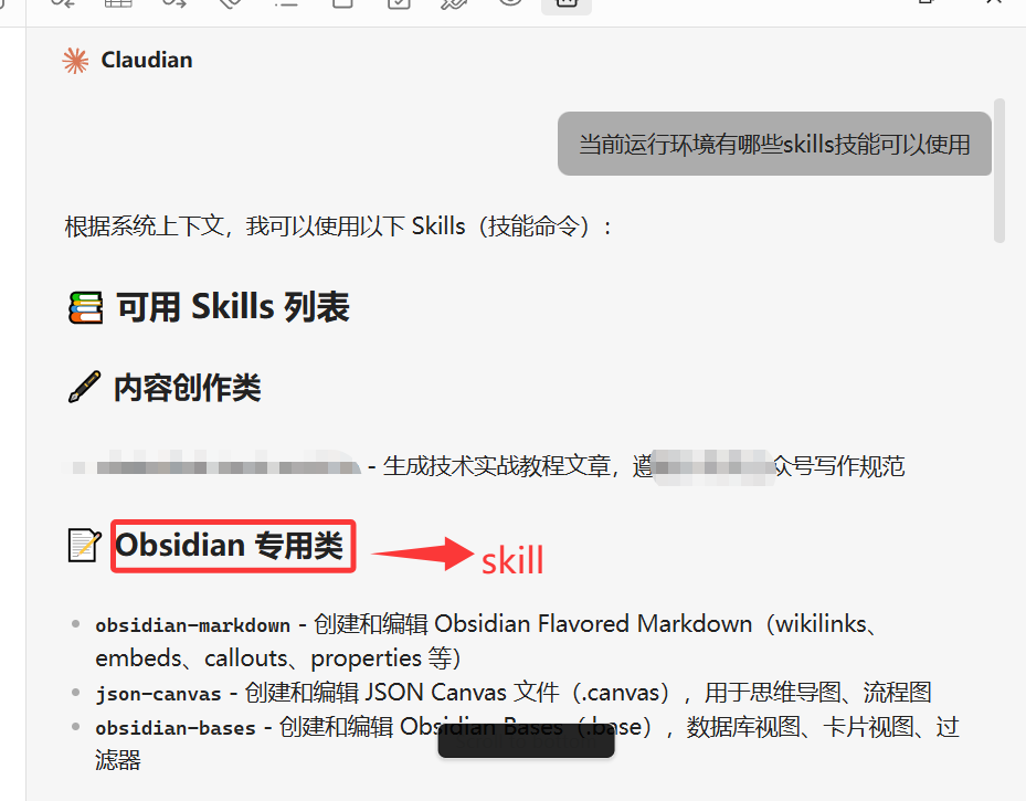 看到上面的信息说明我们Obsidian 也可以使用这个obsidian-skills 技能了。