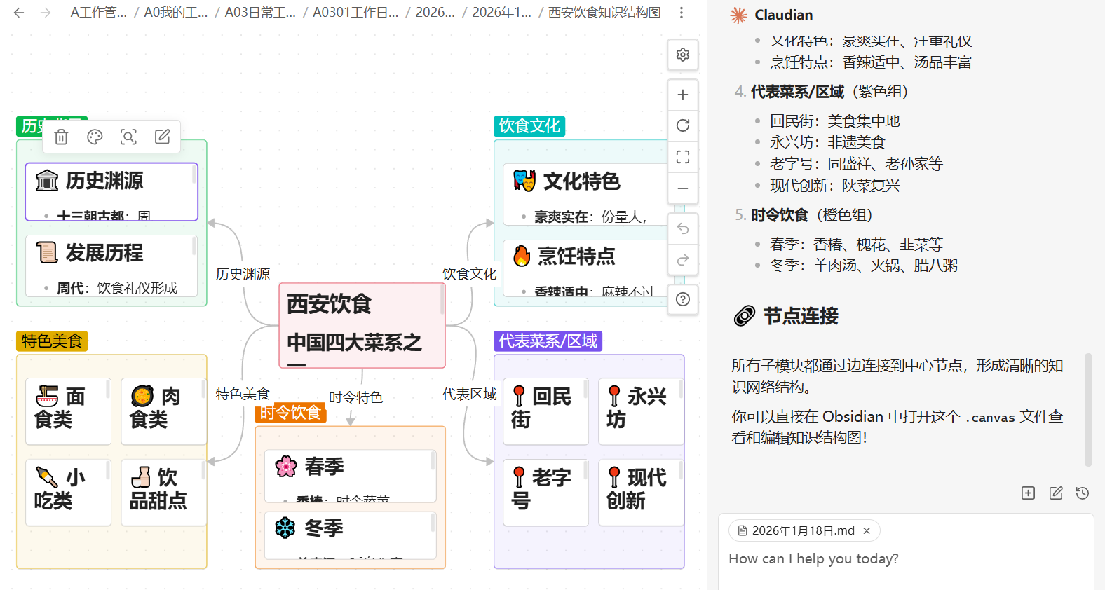 我这里有一个需求希望AI 帮我生成一个西安饮食结构图。这里我们用到obsidian canvas画布功能。