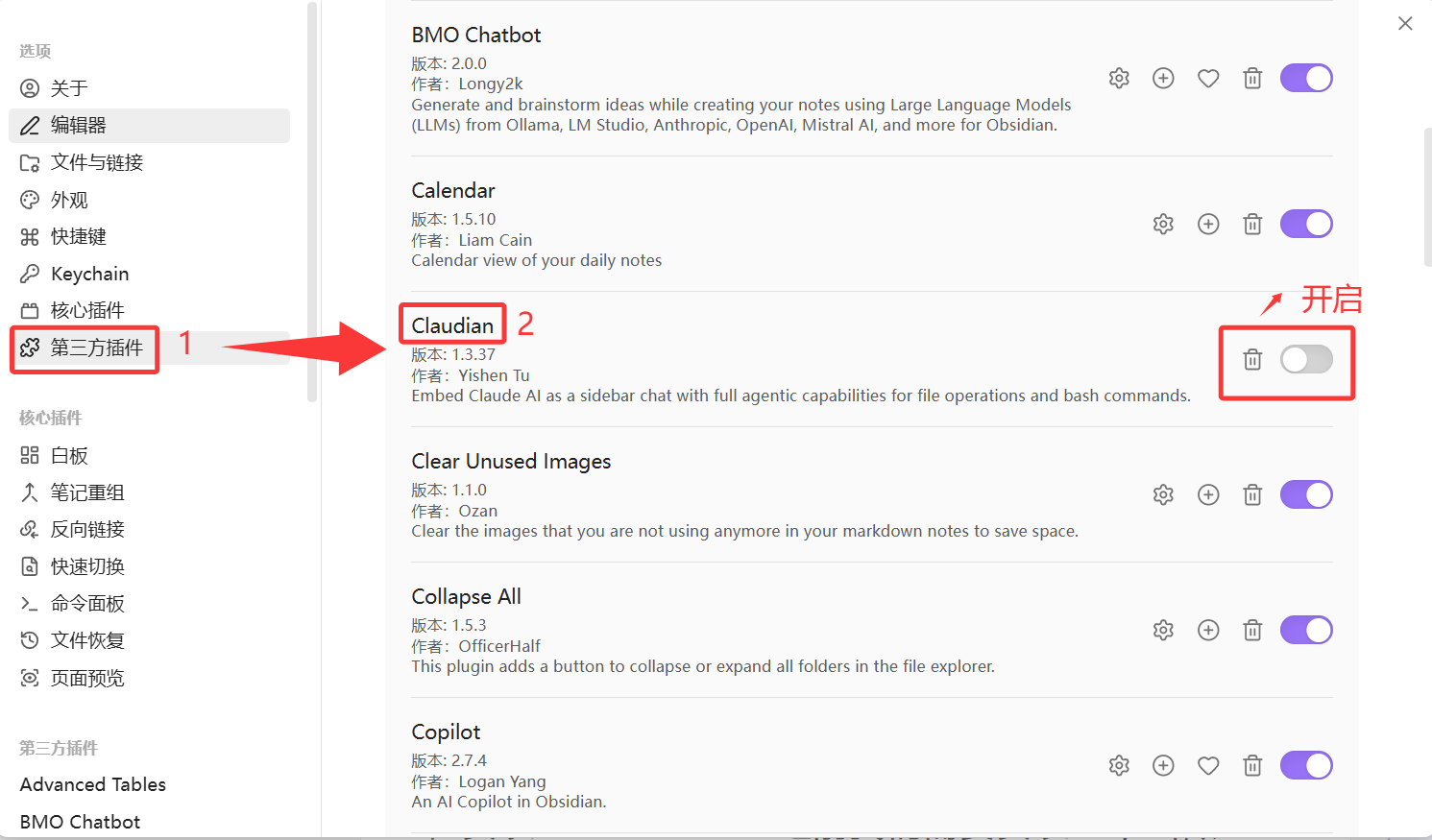 在 Obsidian 中启用插件:Settings → Community plugins → Enable "Claudian"