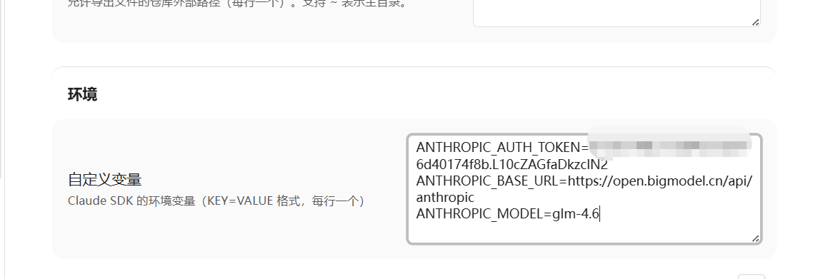 在环境变量里面设置一下自定义apikey apiiurl apimodel,这块我使用智普GLM4.6模型。