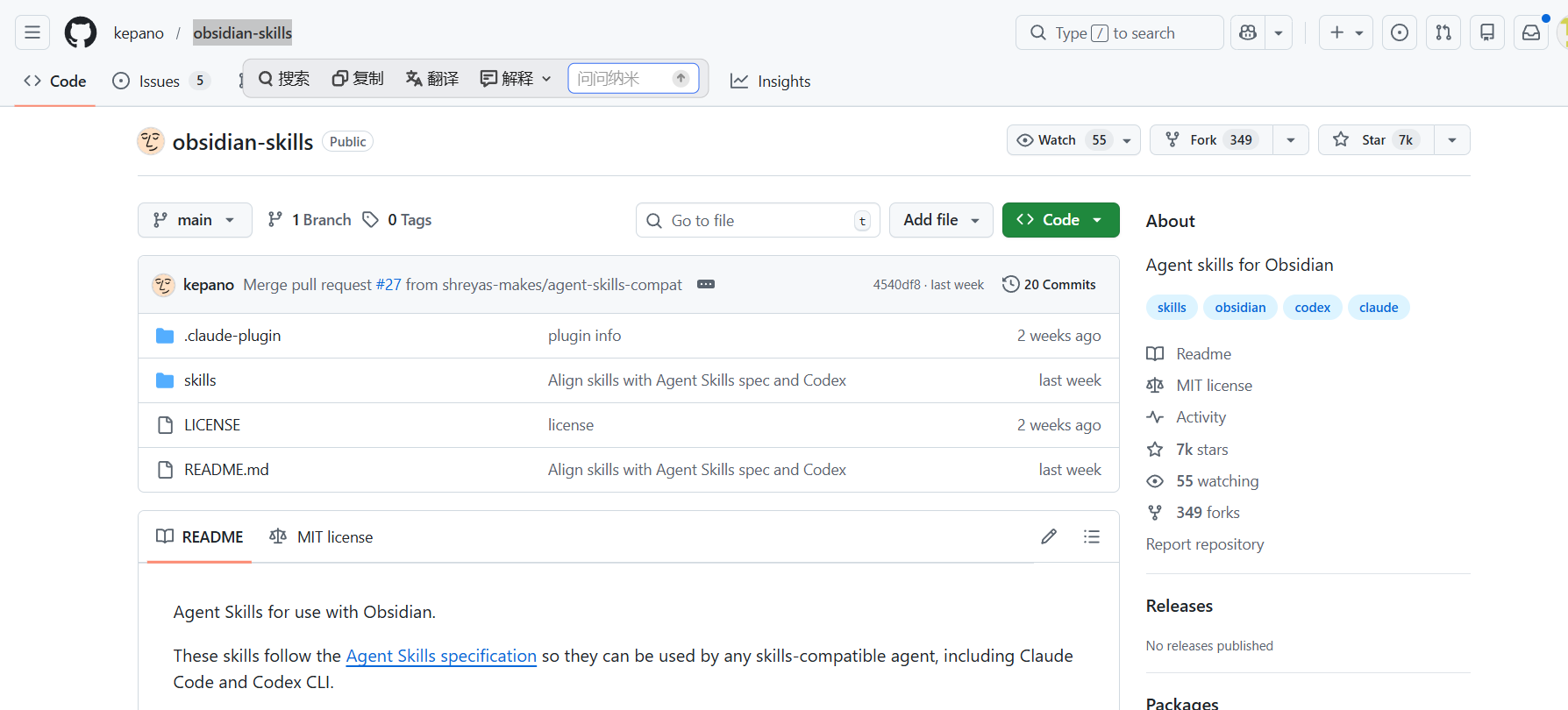 我们去github上找到https://github.com/kepano/obsidian-skills 这个项目。