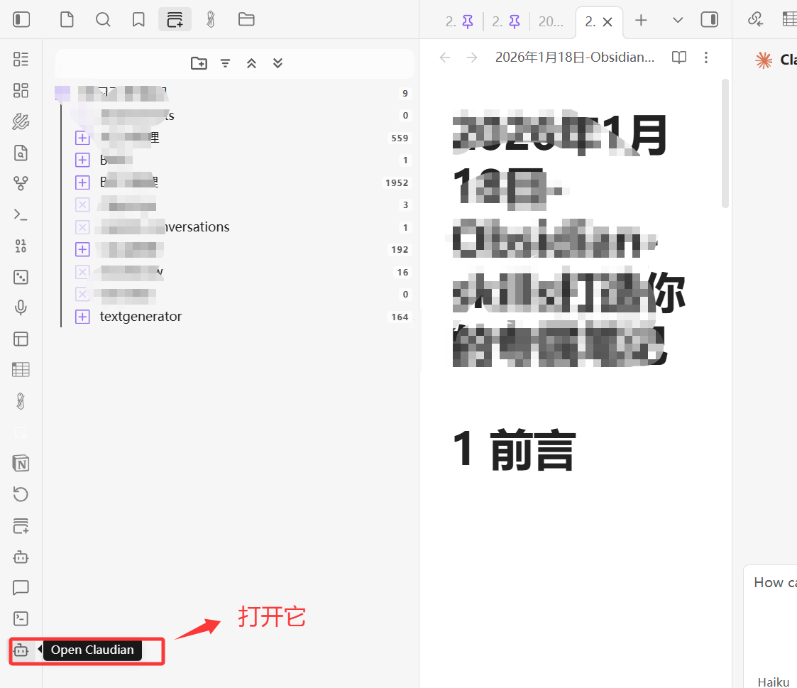 重启Obsidian 左下角就可以看到"open claudian"小图表,我们打开它