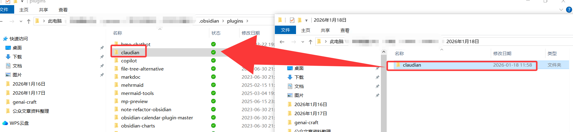 接下来我们把这个复制到本地电脑上安装的obsidian plugin文件夹中。(包含claudian文件夹)