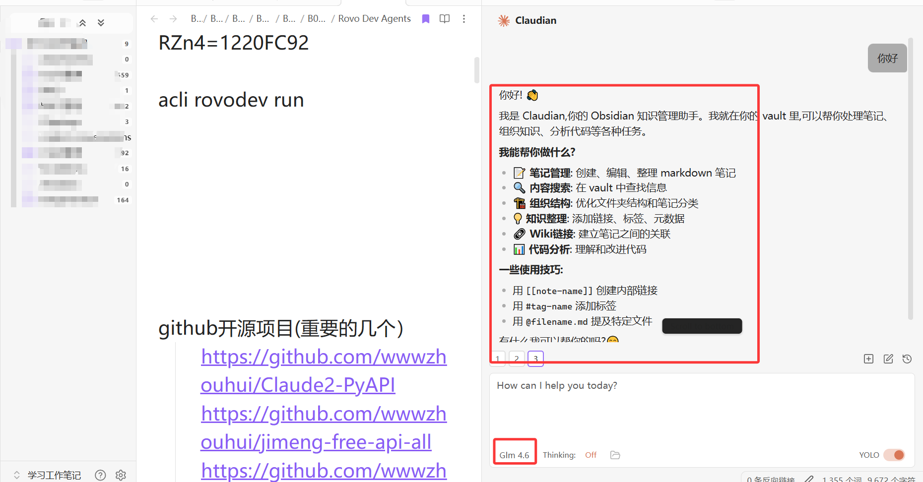 上面模型第三方配置完成后,我们打开Obsidian笔记和右侧的聊天窗口。输入聊天对话信息