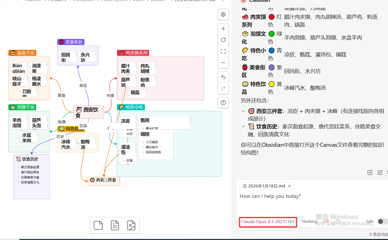 通过上面的截图我们看到用obsidian canvas 生成一个好看西安饮食结构图 这样的笔记直接就可以拿来使用了。当然你觉的画的不好看,你可以换更好的模型,比如claude-opus-4-5-20251101模型。这里我们也只是抛砖引玉,每个模型的AI 画图能力可能不一样。