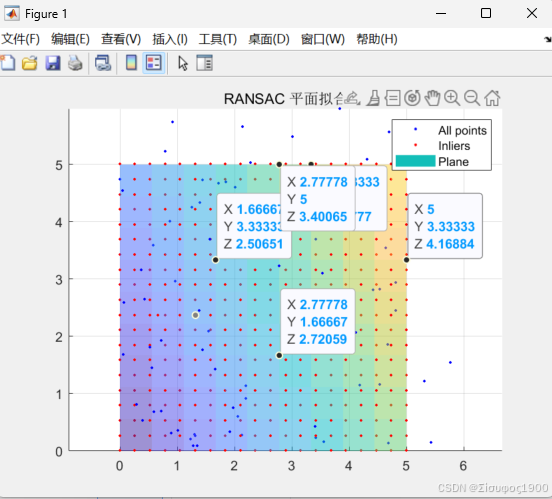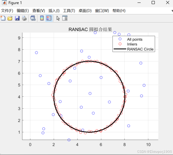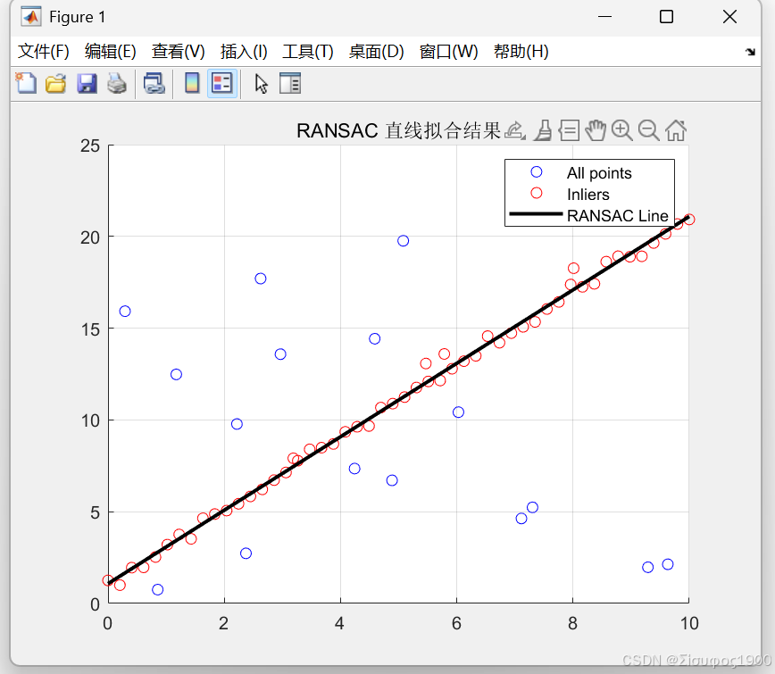 利用随机采样和一致性检验的方法,来取分数据中的内点和外点,内点是指符合模型的数据,外点是指不符合模型的数据。