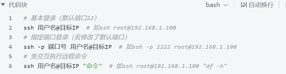 ssh 用户名@目标IP # 无需输入密码即可登录(若设置了密钥密码需输入)
