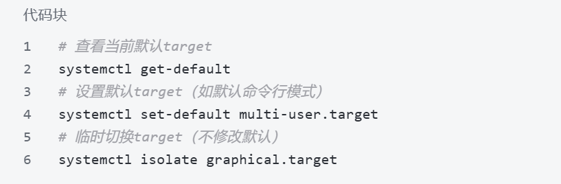 运行级别与target对应:multi-user.target(多用户命令行模式,对应传统3级)、graphical.target(图形界面模式,对应传统5级)。