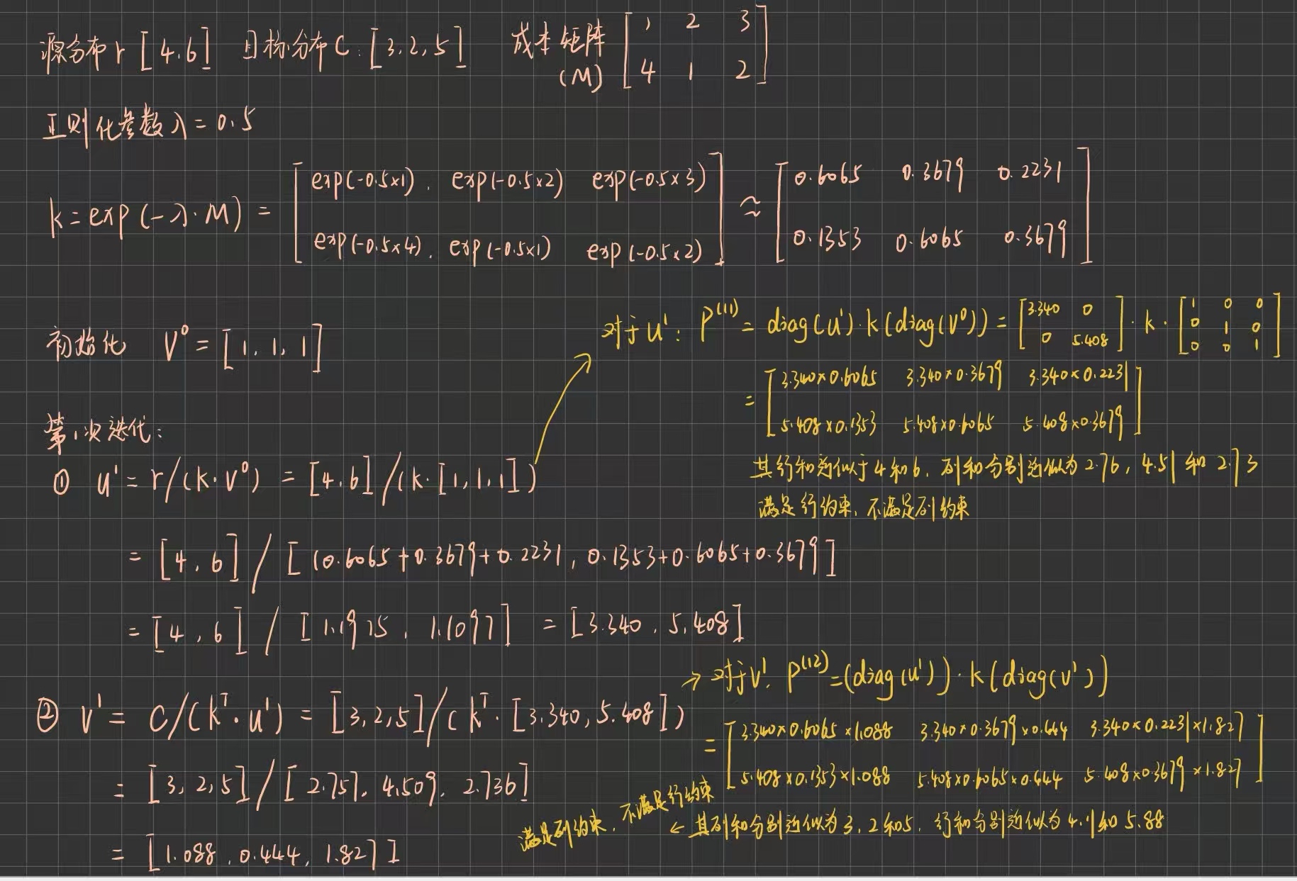 上图中,由源分布控制行约束,目标分布控制列约束,这一点与上周的学习相反。实际上,行与列并非指定分布进行约束,二者是平等的,算法只需根据成本矩阵来交替更新行和列的缩放因子,使两个边际约束同时满足即可。