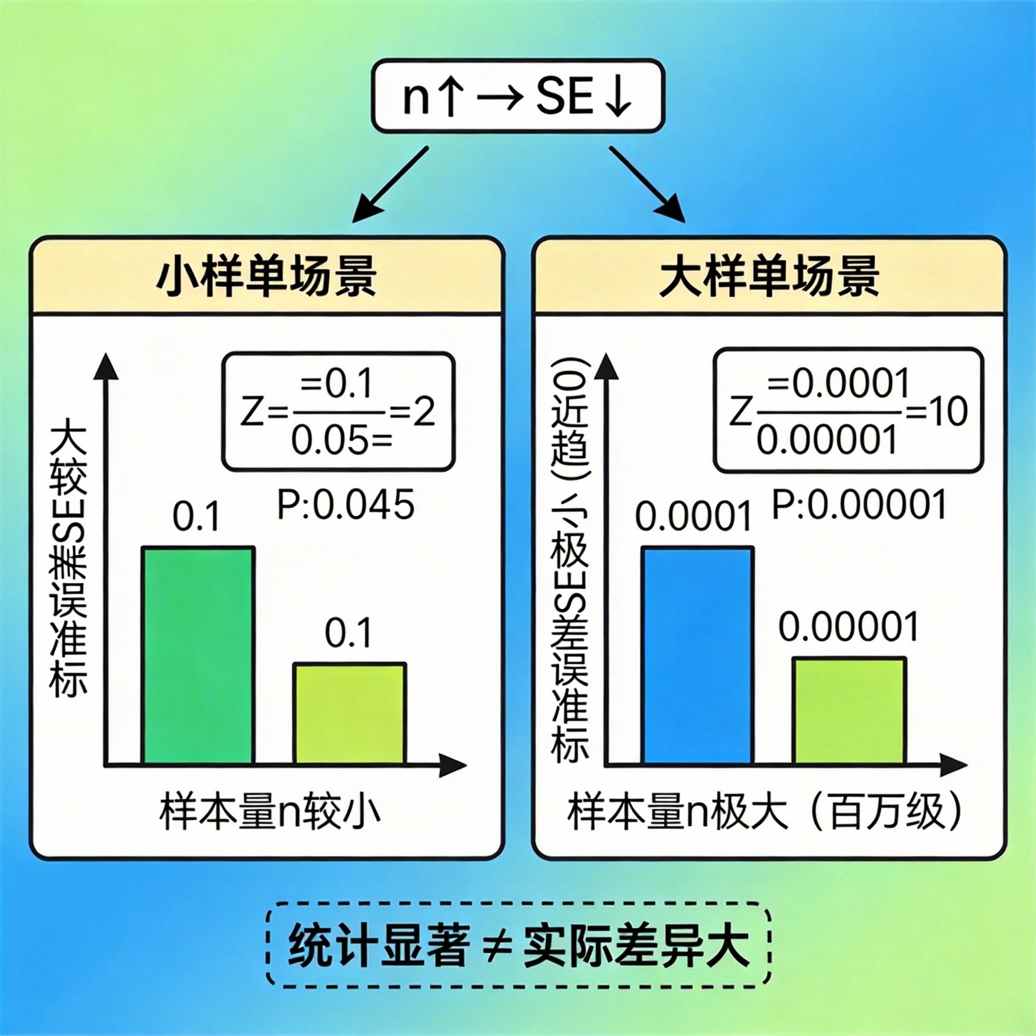 当 nnn 趋向于无穷大时,SESESE 趋向于 0。此时,哪怕分子(两组均值之差)只有微乎其微的 0.0001,算出来的 ZZZ 值也会非常大,从而导致 P 值极小,达成"统计显著"。