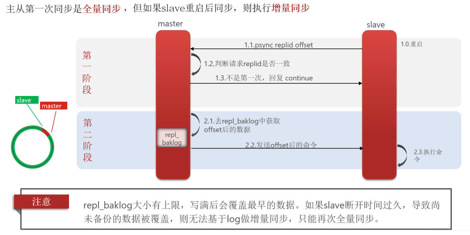 🖊offset:偏移量,随着记录在repl_baklog中的数据增多而逐渐增大。slave完成同步时也会记录当前同步的offset。如果slave的offset小于master的offset,说明slave数据落后于master,需要更新。