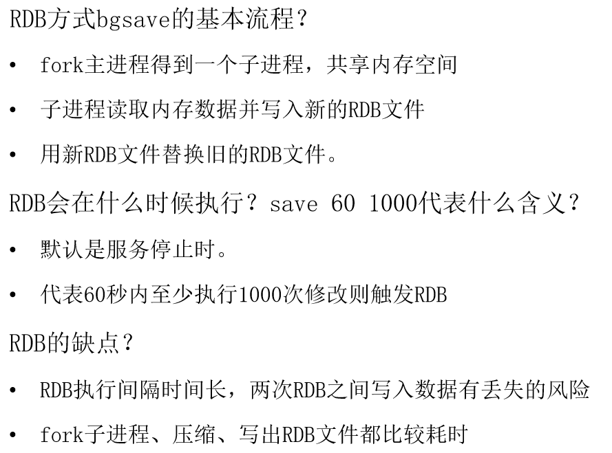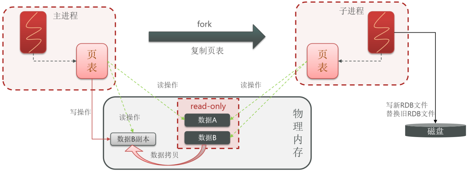 bgsave开始时会fork主进程得到子进程,子进程共享主进程的内存数据。完成fork后读取内存数据并写入 RDB 文件。