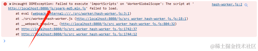 在hash-worker.js中,因为spark-md5跟worker是同目录下,就不需要使用相对路径引入了。