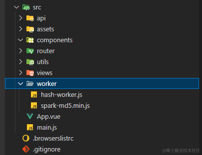在 src 下新建文件夹 worker 再分别新建 hash-worker.js 跟 spark-md5.min.js 文件