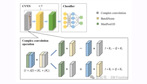 整体框架:采用复数值神经网络(CVNN)作为特征提取器,捕捉射频信号同相(I)和正交(Q)分量的耦合信息,特征提取器包含9个复卷积层,分类器由3个全连接层组成。训练过程中结合数据增强技术,测试时将未见过的领域数据集输入优化后的神经网络进行分类预测。