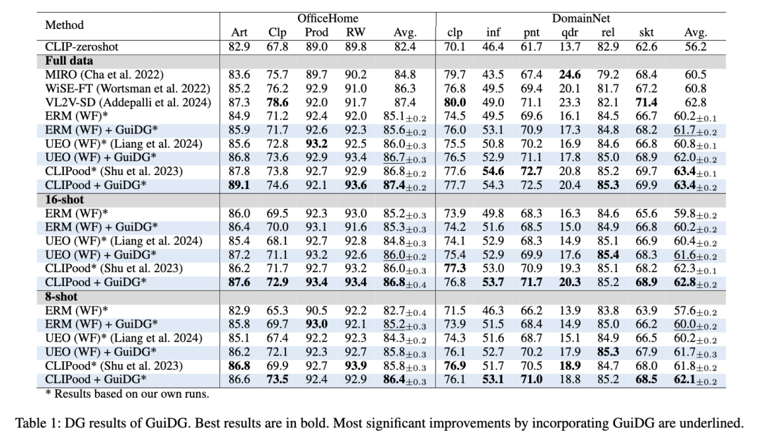 GuiDG在多个主流测试集(OfficeHome、PACS、VLCS等)和新构建的ImageNet-DG上都进行了验证,结果十分亮眼: