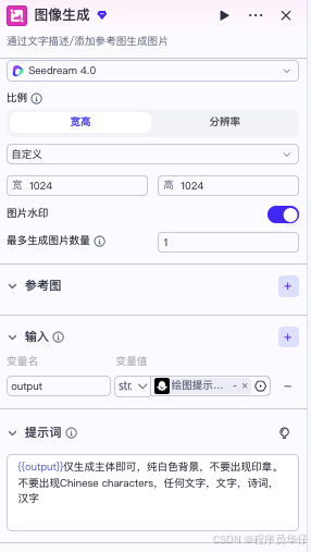 是系统的组件,输入参数为前一个组件的提示词,然后根据提示词,再结合自己的提示词,输出一张图片。