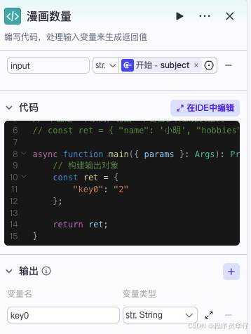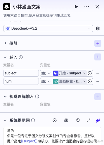 这是大模型组件,输入参数为主题(subject)和漫画数量(num),然后通过一套提示词,生成对应的文案。这个组件输出的是一个数组,有两个子主题。