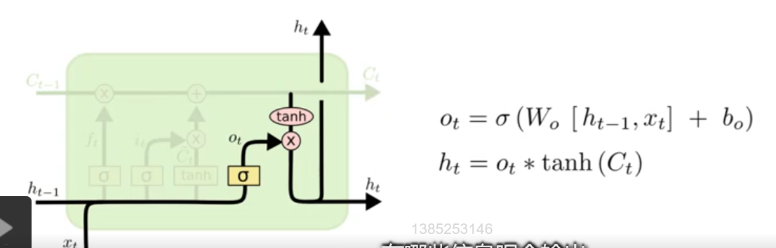 把Ct输给tanh函数,得到一个候选的输出值,运行一个Sigmoid层来确定细胞状态的那部分将输出出去。