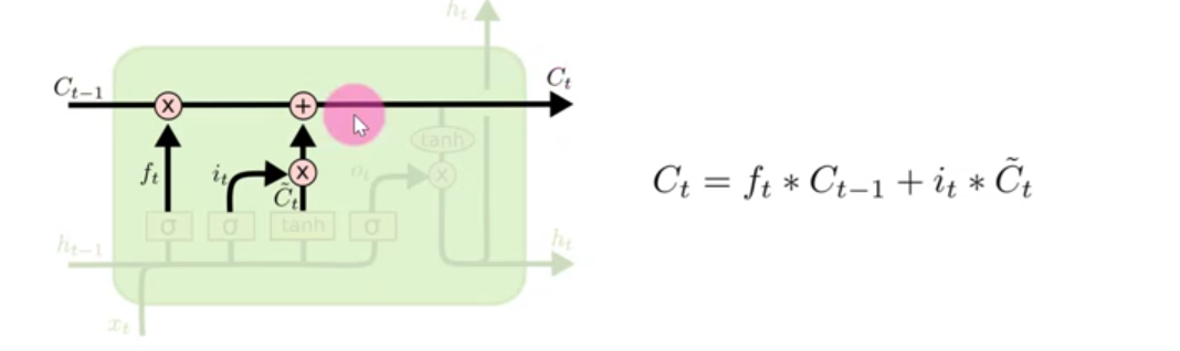 形成新的细胞状态,1.旧的细胞状态Ct-1与ft相乘来丢弃一部分信息。2.再加上it*C他~(i是输入门),生成新的细胞状态Ct