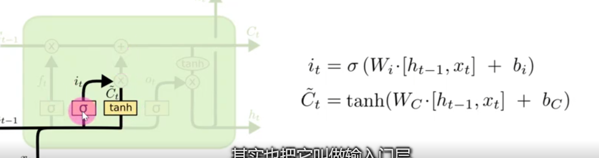 tanh层创建一个新的候选向量ct~,加到状态中。这里sigmoid层称"输入门层",起到一个缩放的作用,这两个信息产生对状态的更新。