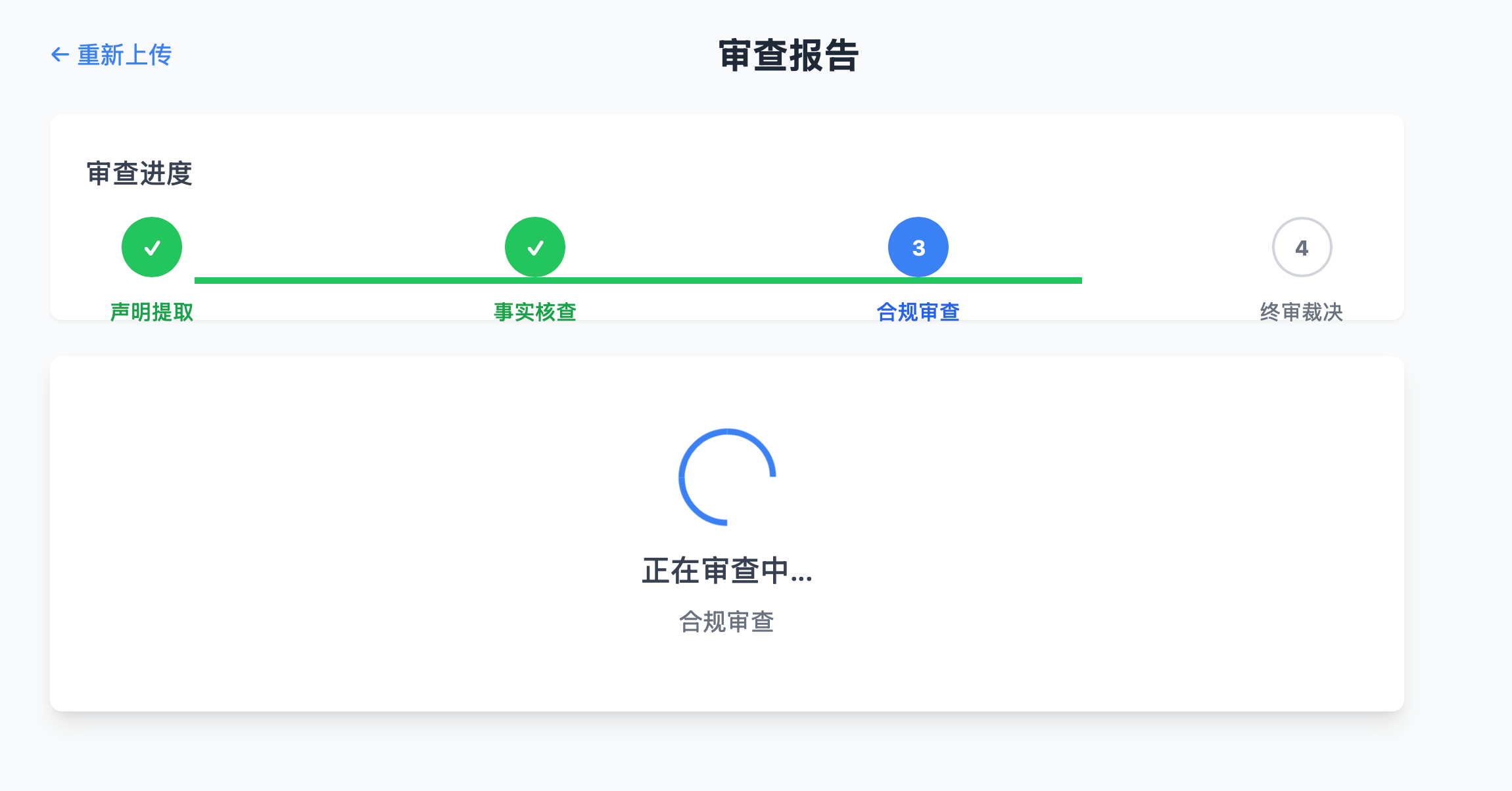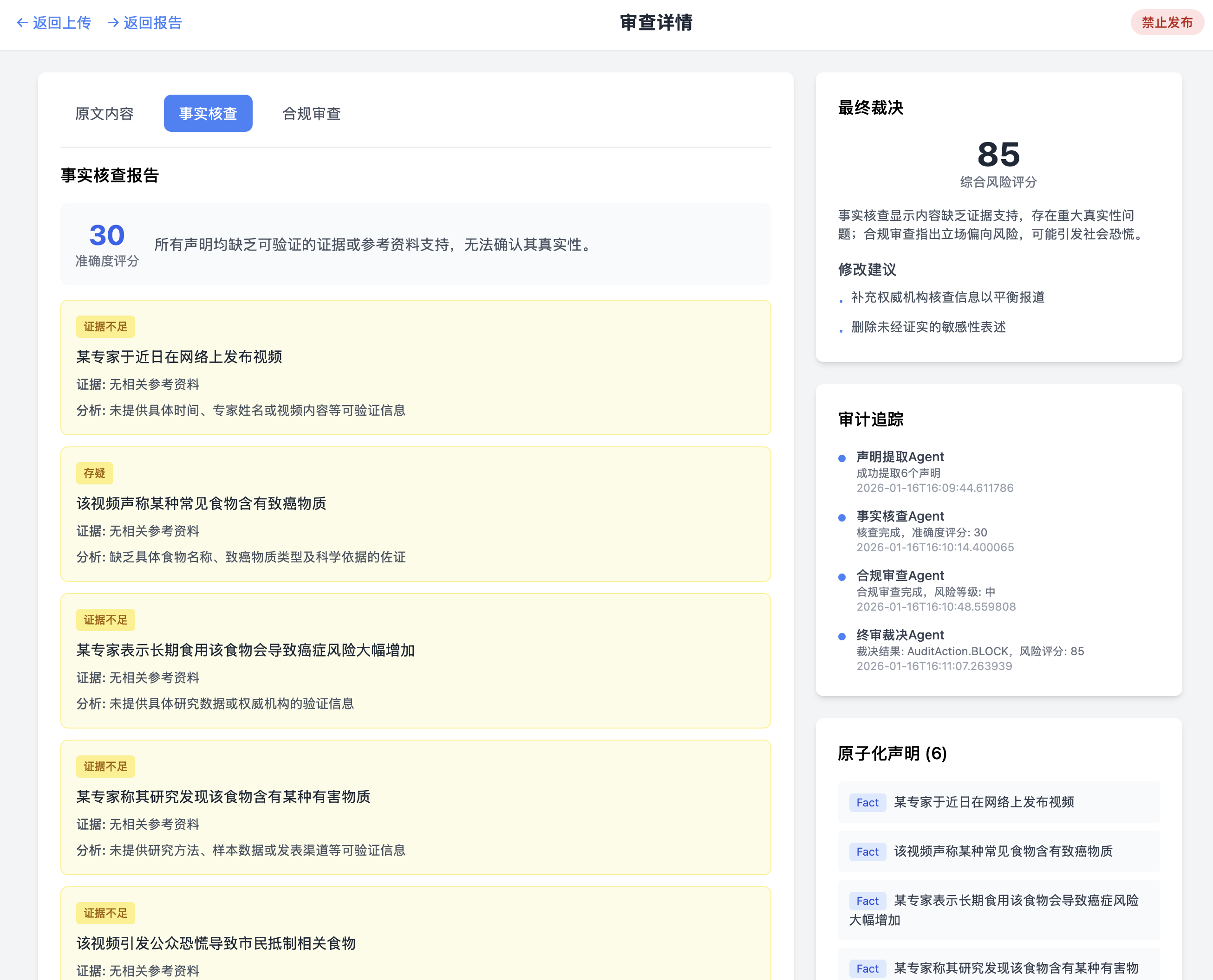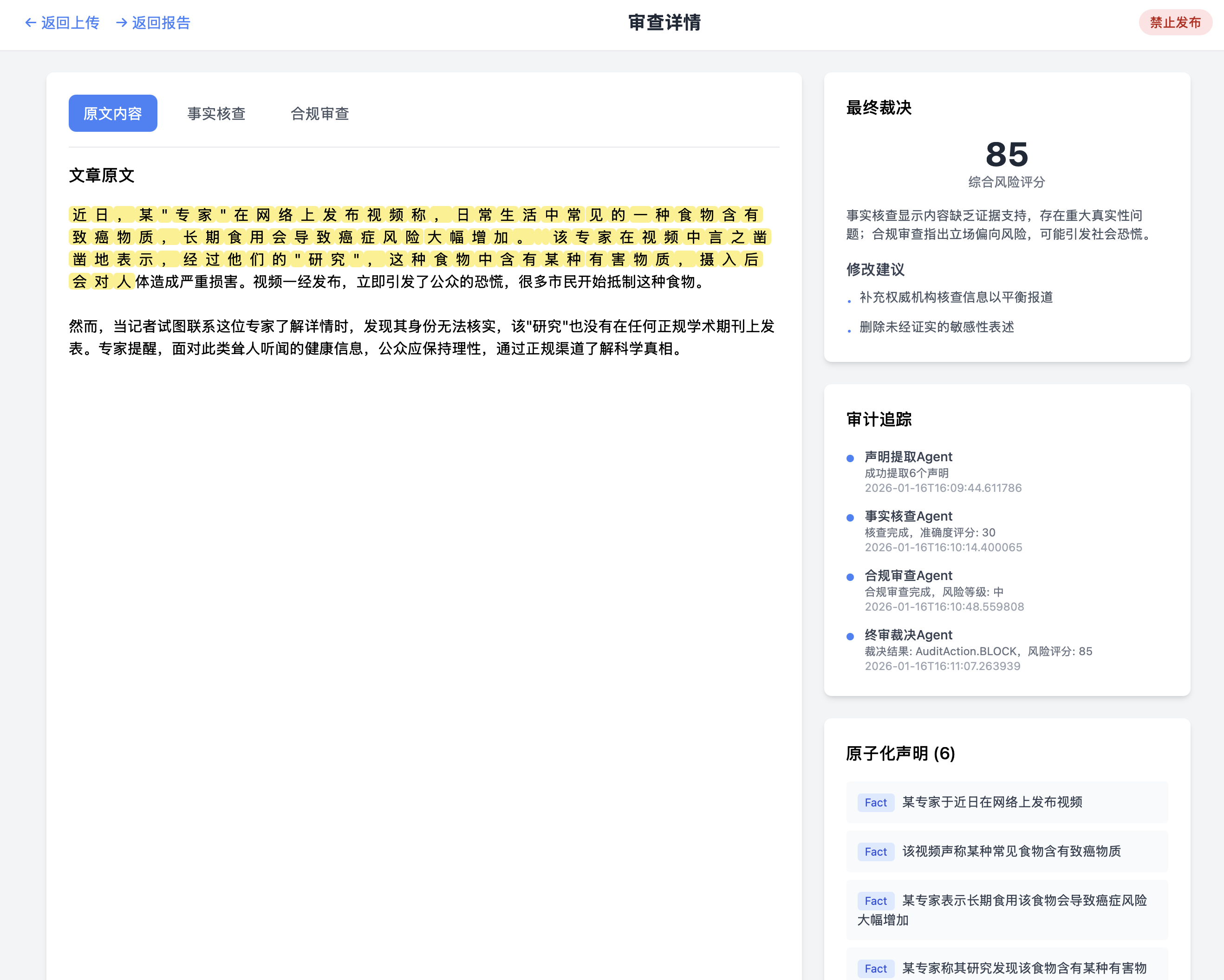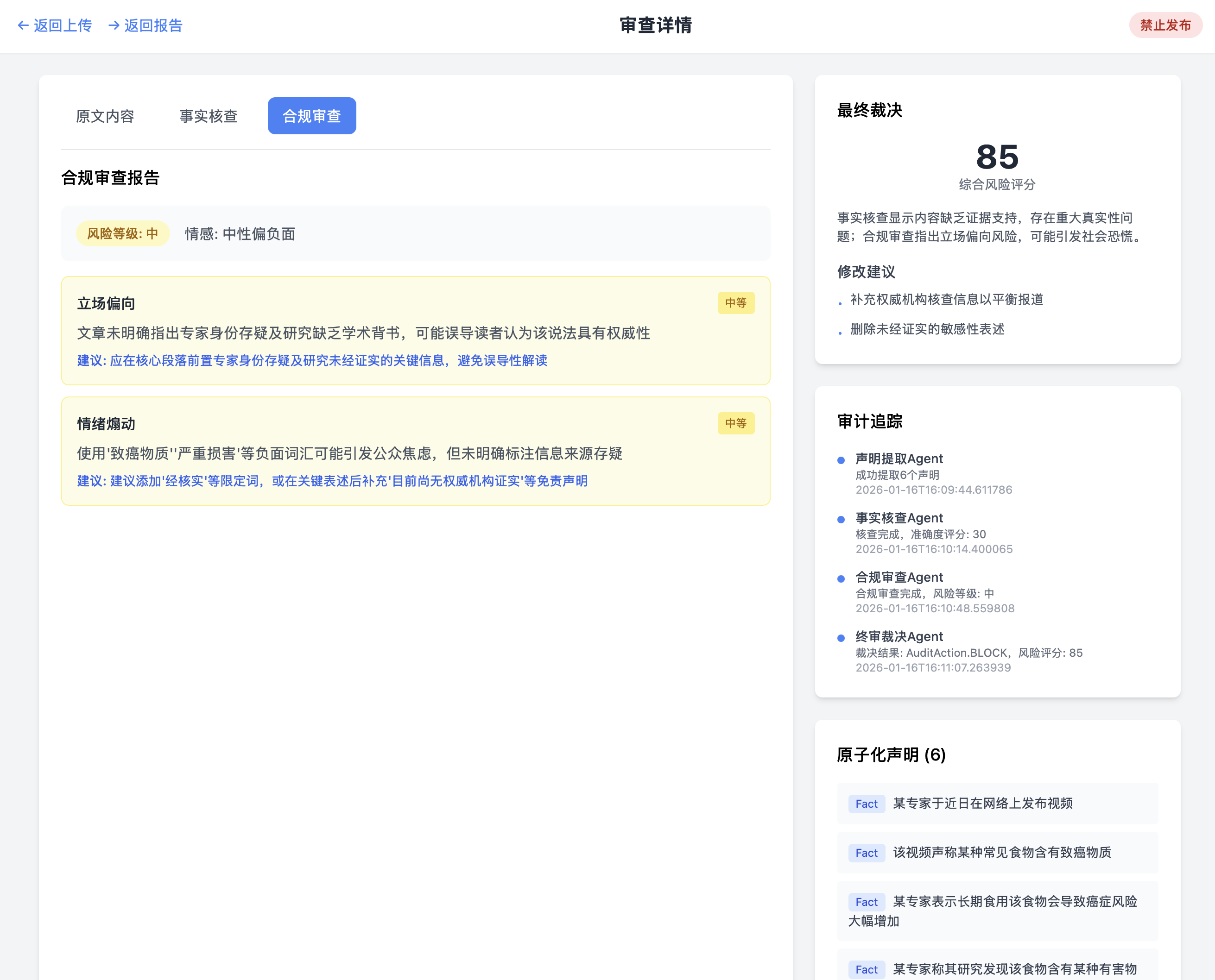 | 合规审查Agent | 检测违规内容和风险 | 声明列表 + 原文 | 合规报告 |