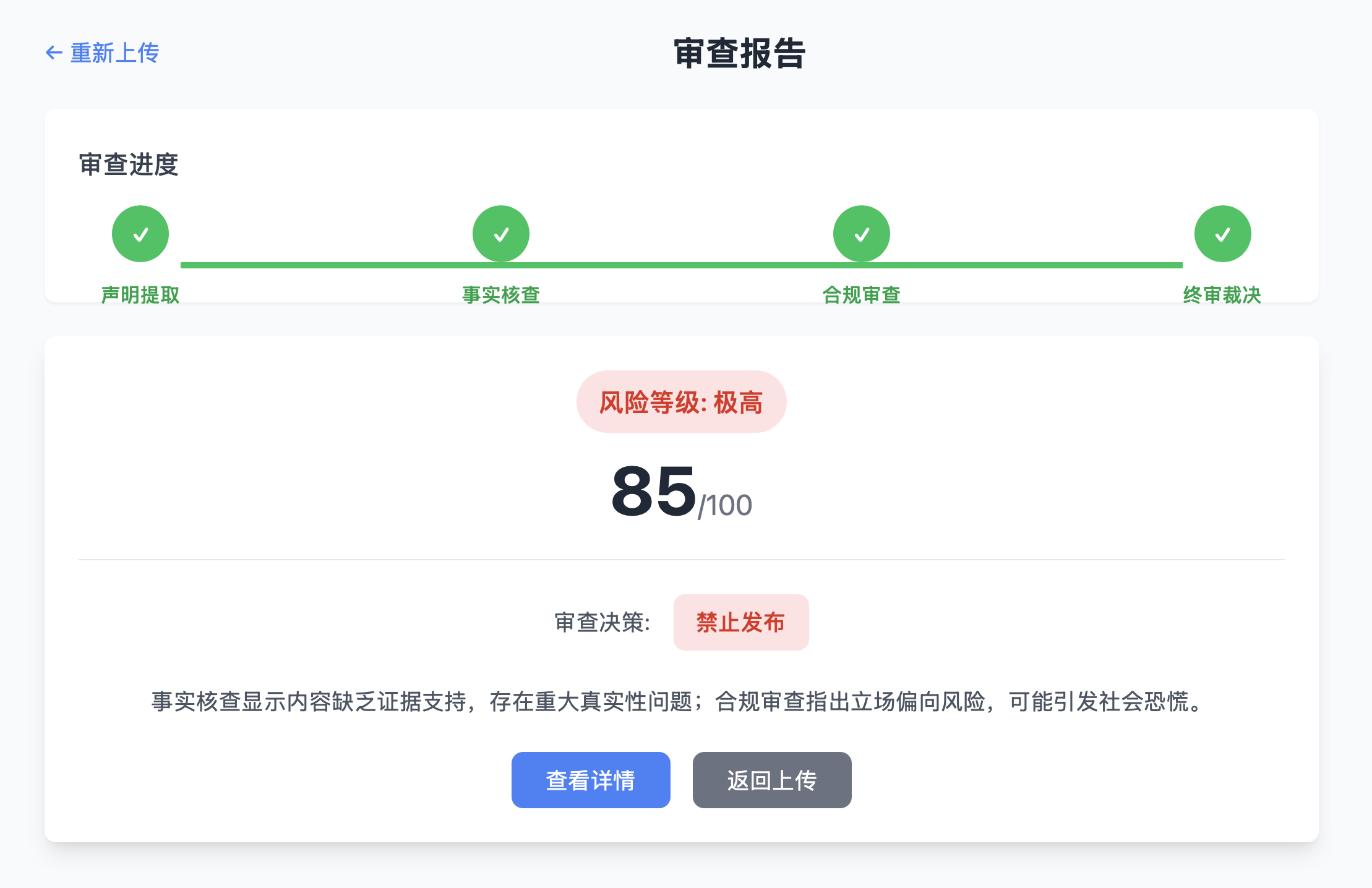 | 61 - 100 | 禁止发布 | 触碰红线或事实严重虚假,予以拦截。 |