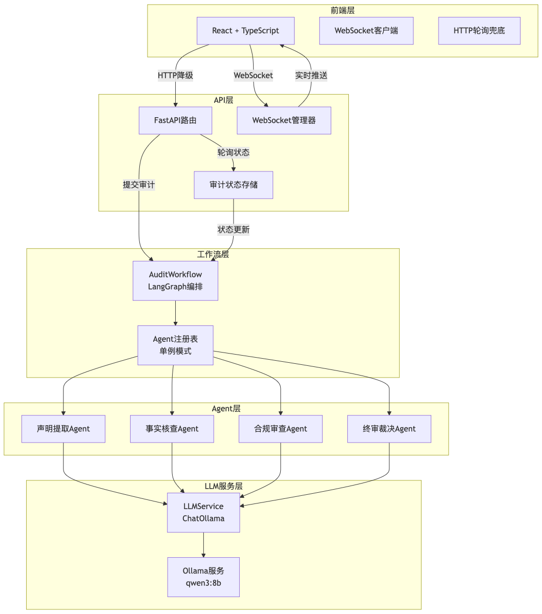 系统采用前后端分离架构,核心由 LangGraph 编排工作流,后端利用 FastAPI 支撑,LLM 服务则由本地运行的 Ollama 提供(模型选用 qwen2.5:7b),并利用 WebSocket 实现审计状态的实时推送。